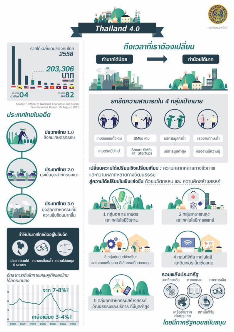 เน้นในเรื่องการพัฒนาสู่ ความมั่นคง มั่งคั่ง และยั่งยืน ด้วยการสร้างความเข้มแข็งจากภายใน ขับเคลื่อนตามแนวคิดปรัชญาเศรษฐกิจพอเพียงผ่านกลไกประชารัฐทำให้ประเทศก้าวไปสู่ประเทศไทย 4.0 อันเป็นเศรษฐกิจที่ขับเคลื่อนด้วยนวัตกรรมและความคิดสร้างสรรค์ เนื่องจากปัจจุบันประเทศไทยยังอยู่ในยุคที่การผลิตเชิงอุตสาหกรรม (Mass Production) ทำงานในลักษณะของการทำมากได้น้อย เน้นการแข่งขันด้วยราคาและค่าแรงที่ต่ำส่งผล ให้ติดอยู่กับกับดักรายได้ปานกลางจำเป็นต้องพัฒนาสินค้าและบริการ ทั้งภาคเกษตรกรรม อุตสาหกรรมรวมถึงการค้าและบริการ ให้มีความคิดสร้างสรรค์และนวัตกรรมเพื่อให้ธุรกิจทำน้อยได้มาก